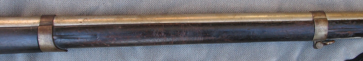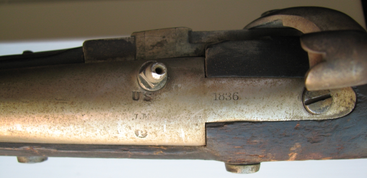 Clearly visible on the top of the barrel is the date "1836", a "US" stamp, the initials "J. M." and the letter "P". I've found no documents that will explain what these represent.