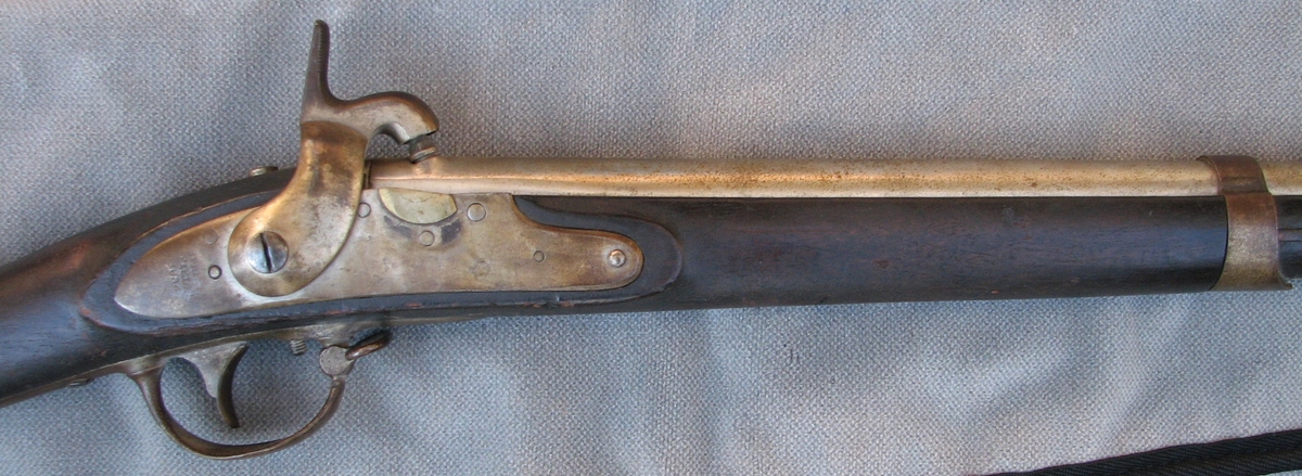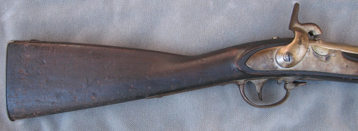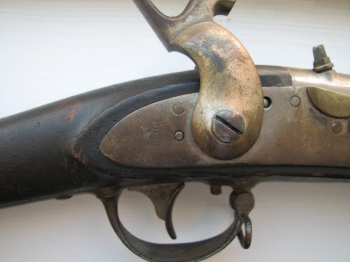 There should be an eagle and the initials US in front of the hammer, but this looks like it was ground off. I was told by someone that this was done with a lot of the weapons that were used by the Confederate States of America which were manufactured in the "North" in the "War of Northern Aggression"