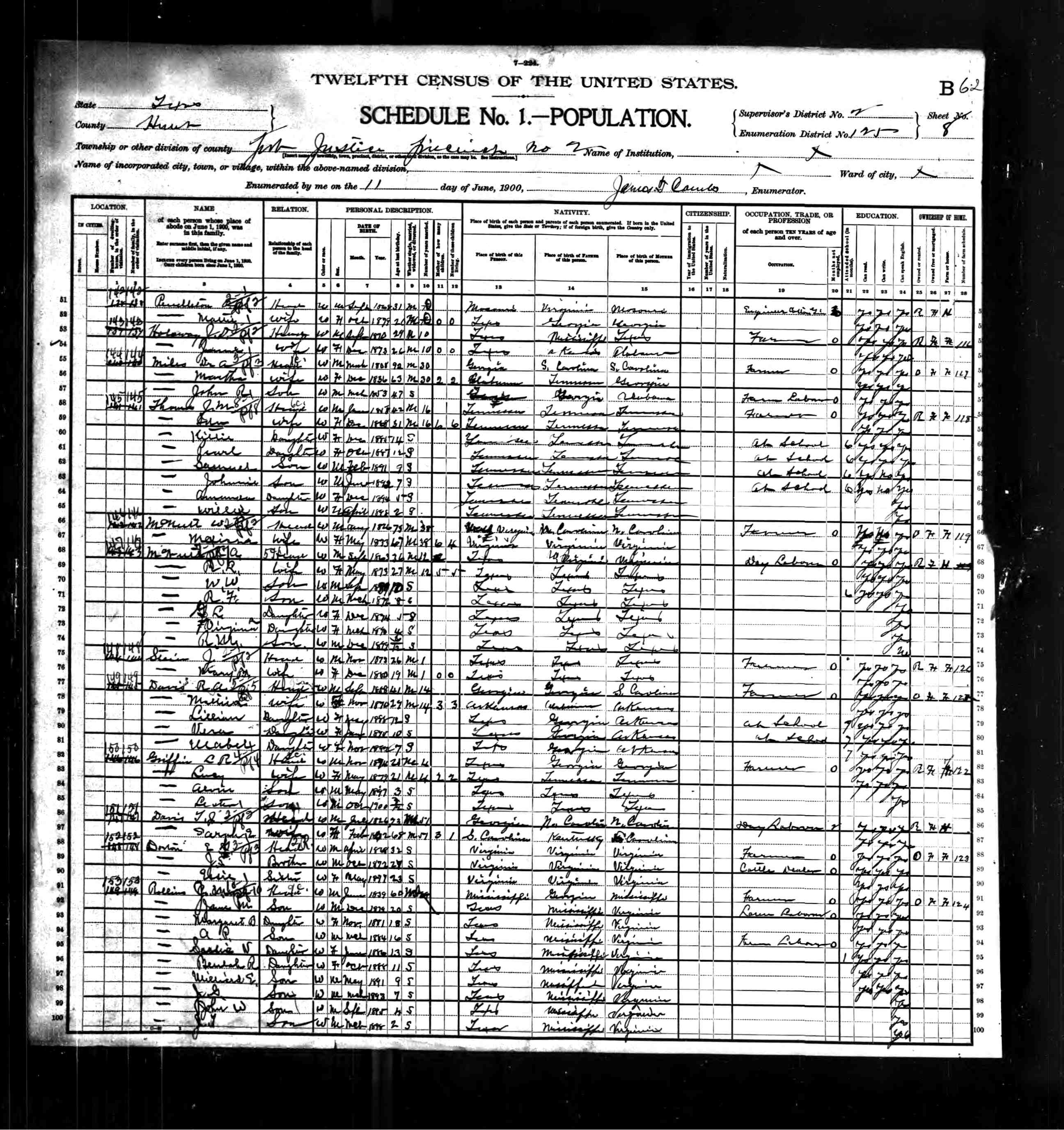 1900 United States Federal Census > Texas > Hunt > Justice Precinct 2 > District 125 > Line 88