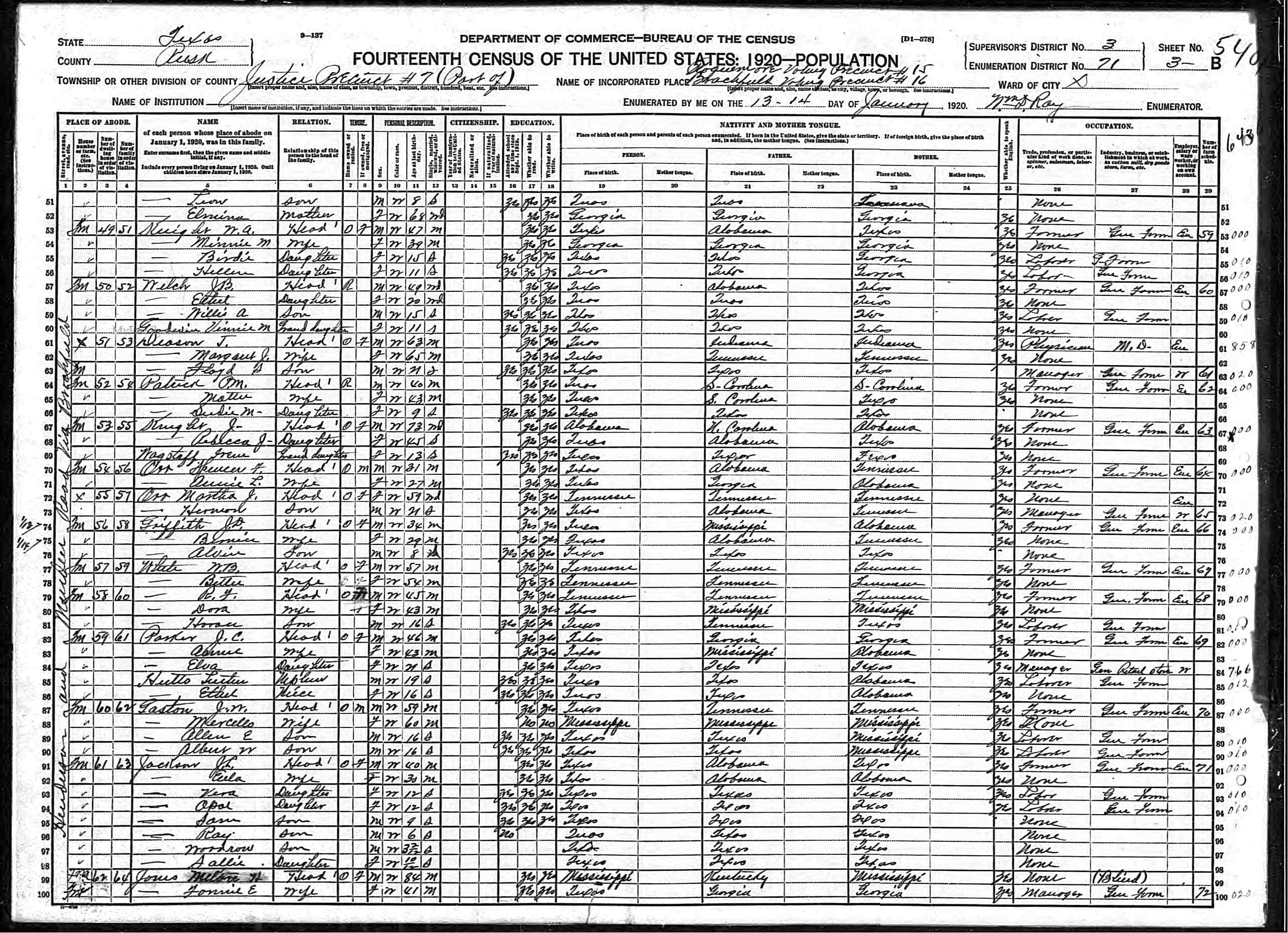 1920 United States Federal Census > Texas > Rusk > Roguemore and Brockfield > District 71 > Line 61